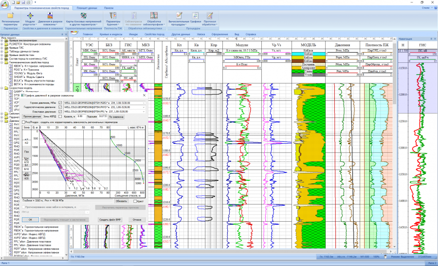 Расчет горного, порового и других давлений; выделение зон АВПД; расчет бокового напряжения, давления гидроразрыва, гидростатического давления; расчет критериев Мора-Коломба; обработка кривых мини-ГРП; обработка данных радиусомера.